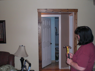 Finished doorway. It looks a lot better than a white doorway with all the new wood floors and brown, leather furniture down in our den. |